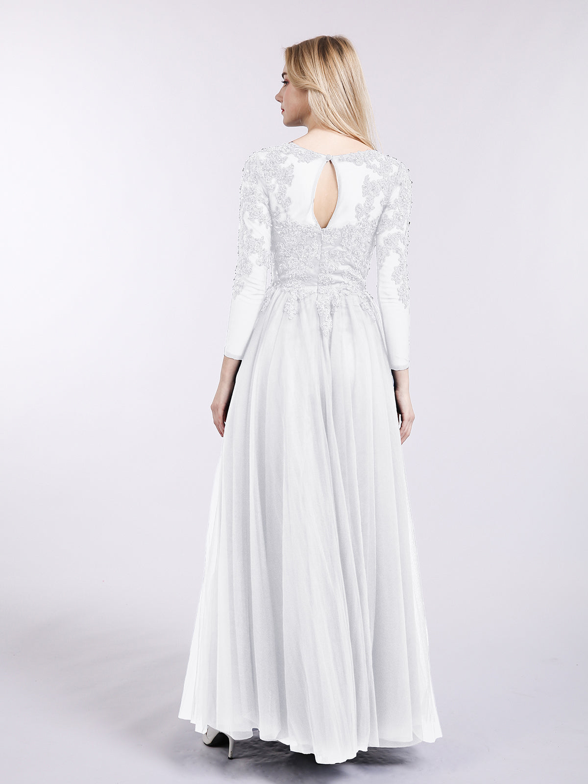 Tulle with Appliqued Long Sleeves Dress-White Plus Size