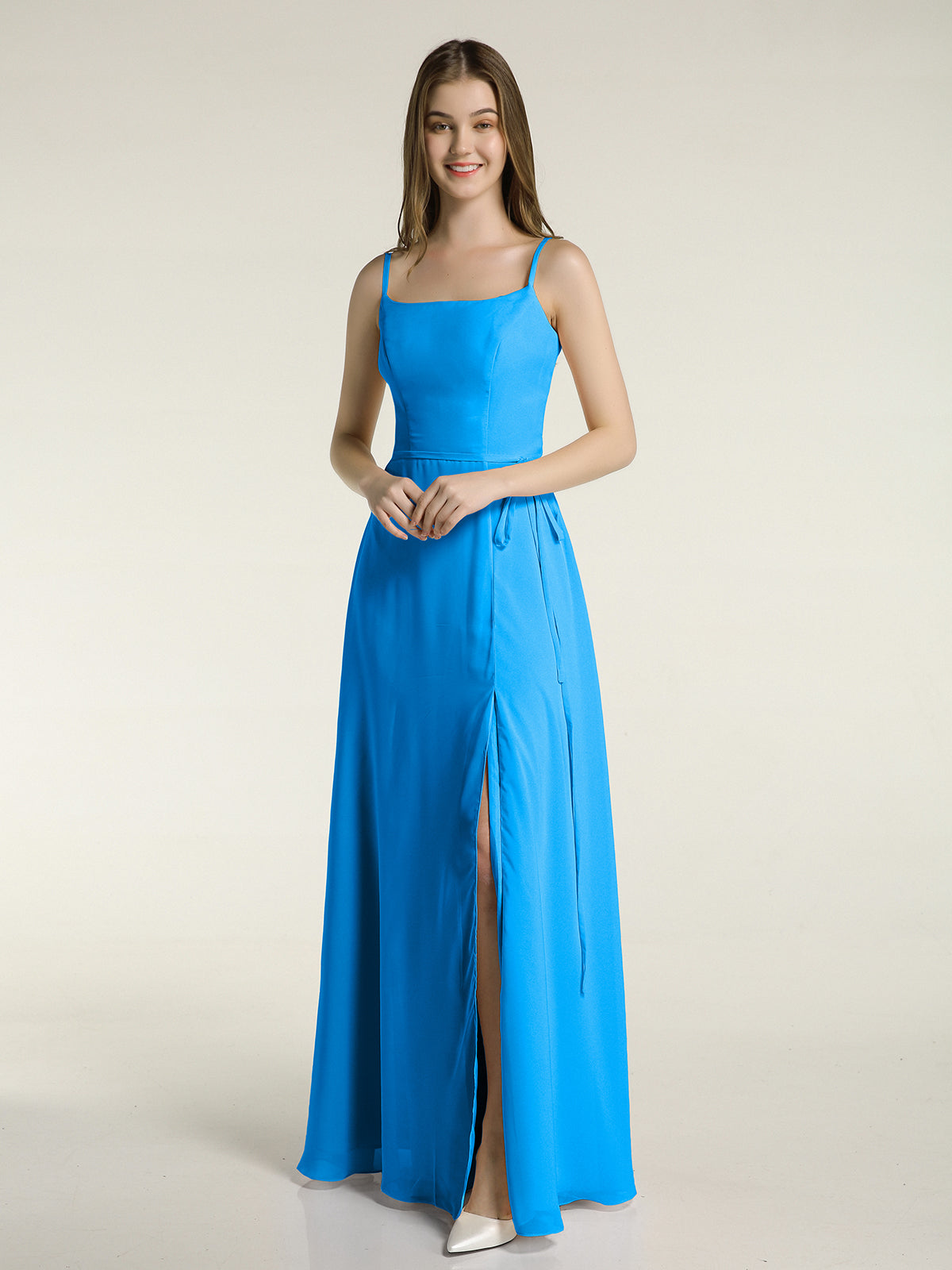 Simple Spaghetti Strap Chiffon Gowns with Slit-Ocean Blue Plus Size