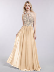 Halter Chiffon with Gold Appliqued Dress-Peach