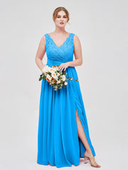 V Neck Chiffon And Lace Dress with Slit Ocean Blue Plus Size