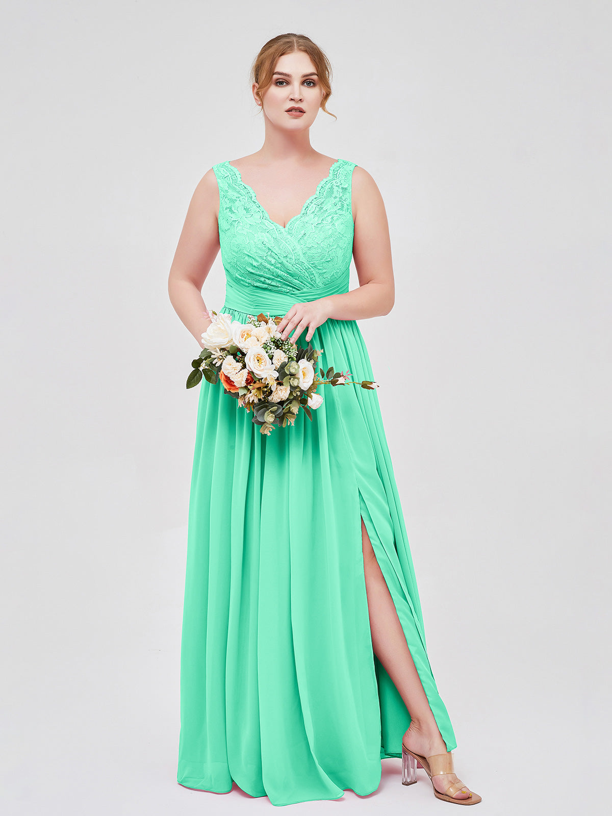 V Neck Chiffon And Lace Dress with Slit Turquoise Plus Size