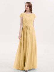 Long Bridesmaid Dresses with Cap Sleeves Gold
