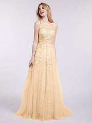 Illusion Neck Tulle with Appliqued Dress-Peach
