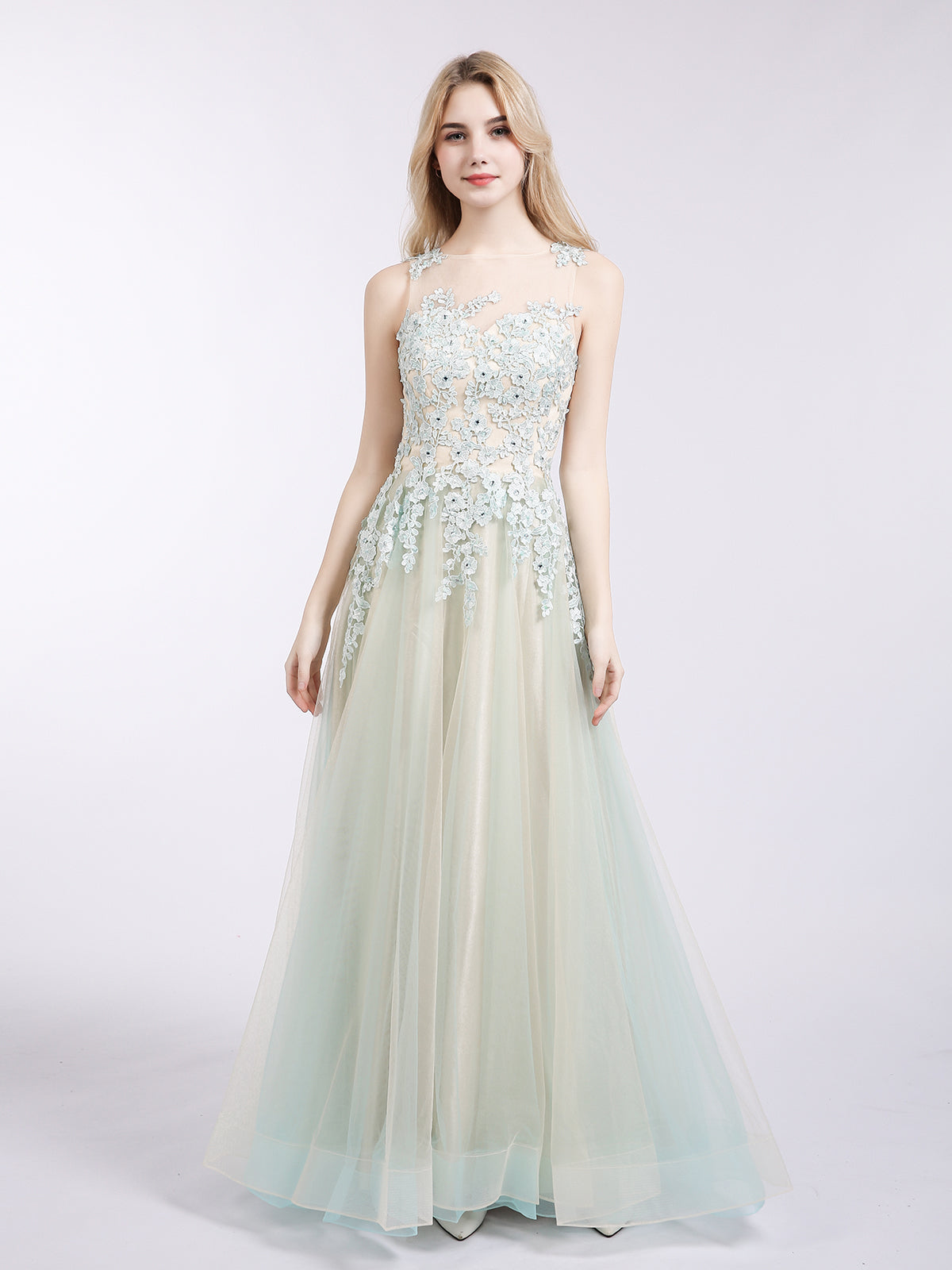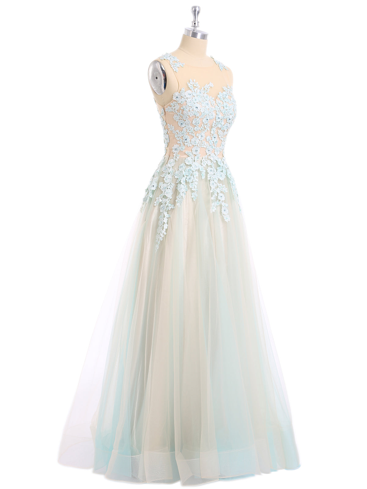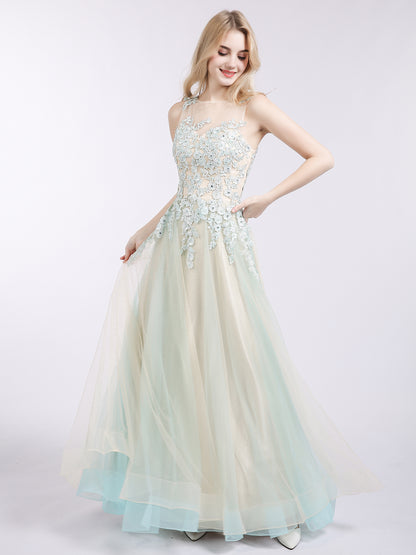 Illusion Neck Two Colors Tulle Dress-Champagne
