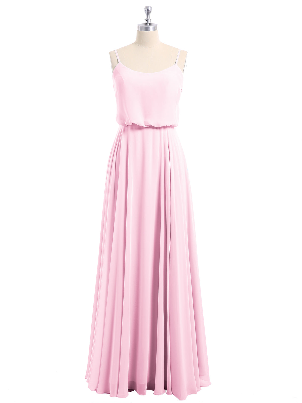 • The spaghetti strap floor-length dress has a cute shallow round neck.