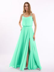 Spaghetti Strap Scoop Chiffon Dresses with Slit Turquoise