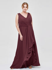 V-neck Chiffon Bridesmaid Gown with Cascade Skirt Cabernet Plus Size