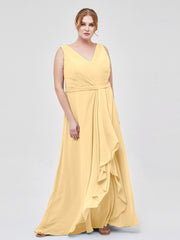 V-neck Chiffon Bridesmaid Gown with Cascade Skirt Gold Plus Size