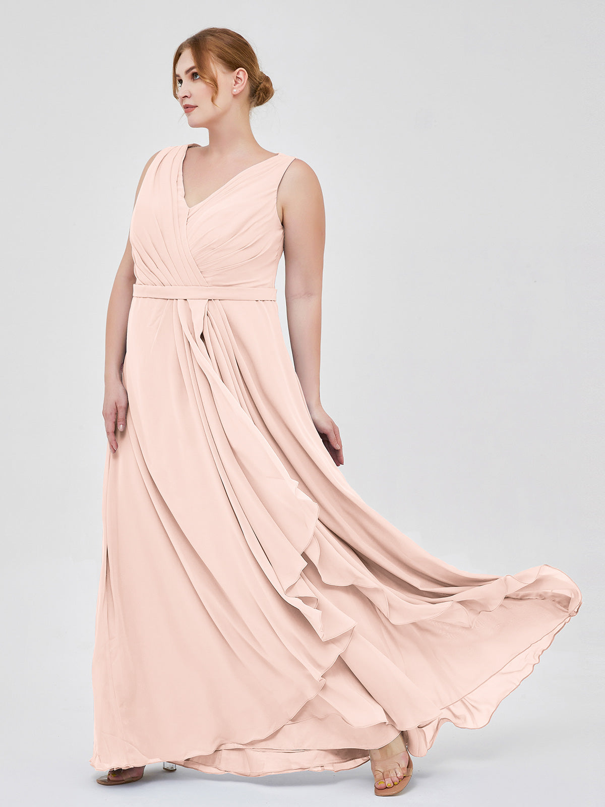 V-neck Chiffon Bridesmaid Gown with Cascade Skirt Pearl Pink Plus Size