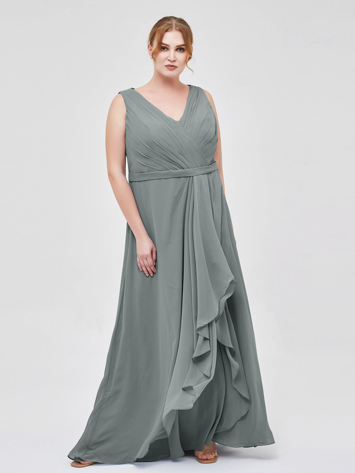V-neck Chiffon Bridesmaid Gown with Cascade Skirt Steel Grey Plus Size
