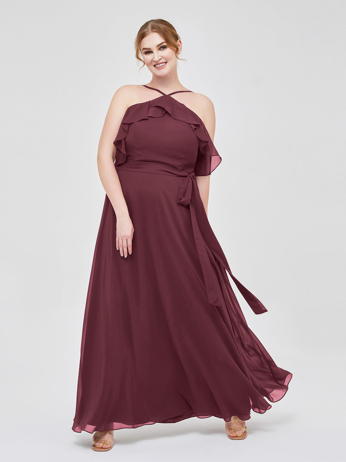 Y-neck Flutter Sleeves Long Bridesmaid Dresses Cabernet Plus Size