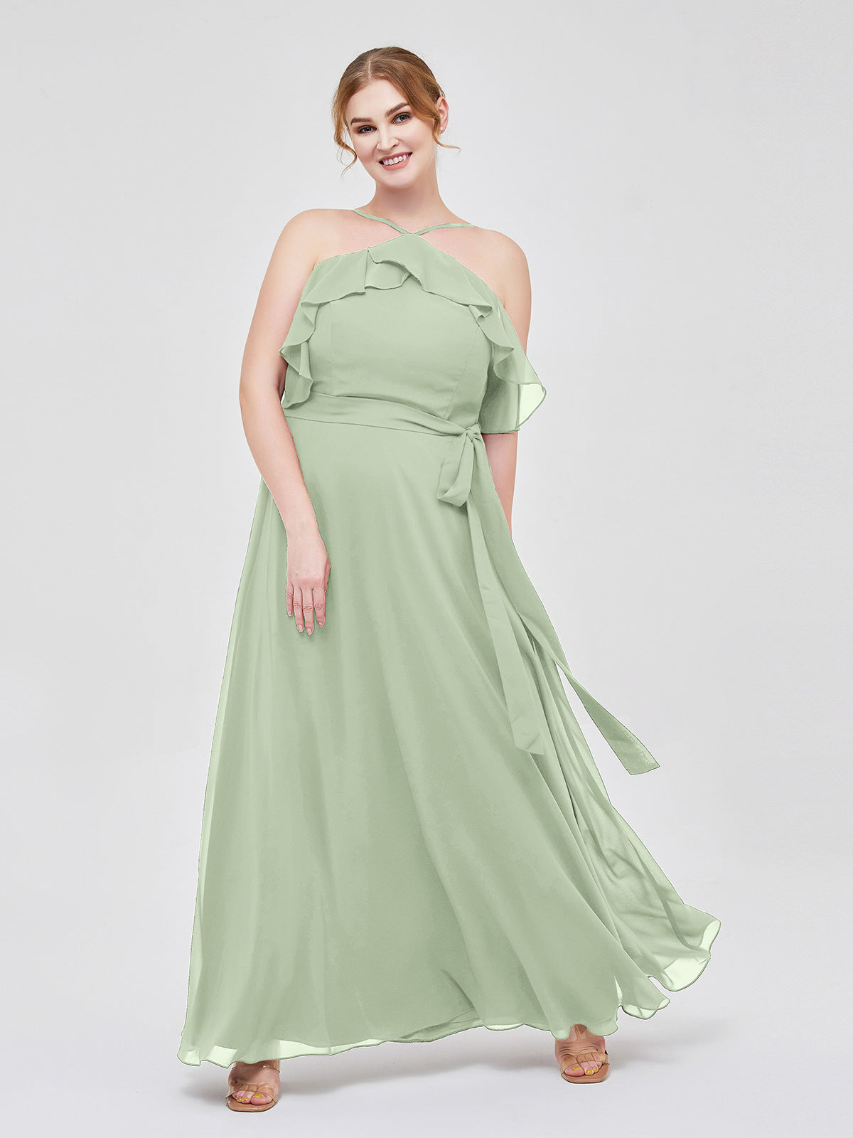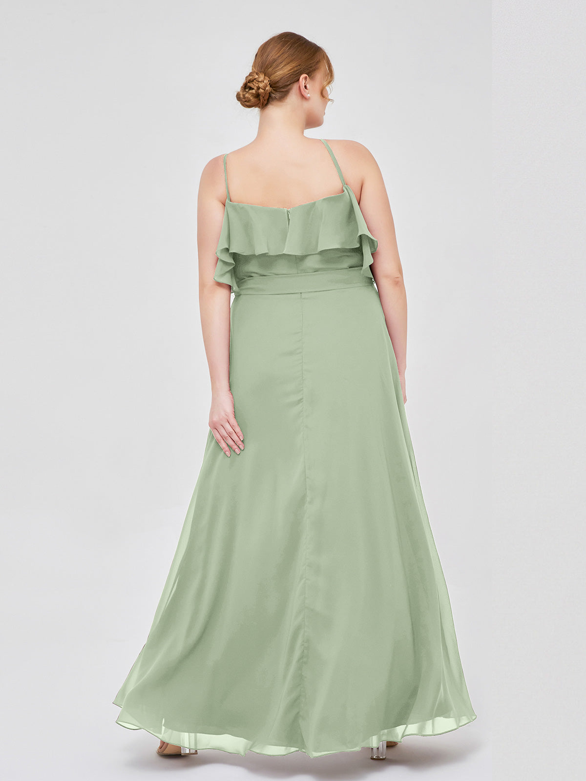 Y-neck Flutter Sleeves Long Bridesmaid Dresses Dusty Sage Plus Size