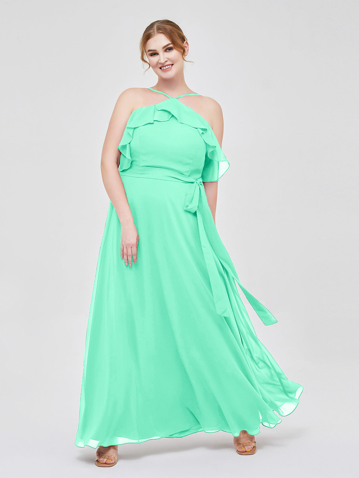 Y-neck Flutter Sleeves Long Bridesmaid Dresses Turquoise Plus Size