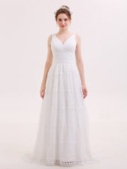 V Neck Vitange Lace Boho Wedding Dresses-Champagne