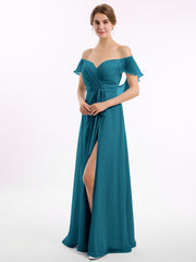 • Sally is beautiful long off the shoulder dress made of chiffon.