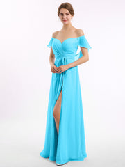 • Sally is beautiful long off the shoulder dress made of chiffon.