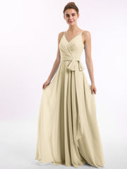 Spaghetti Strap Chiffon Dresses with Sash Bow-Champagne