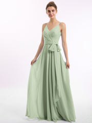 Spaghetti Strap Chiffon Dresses with Sash Bow-Dusty Sage