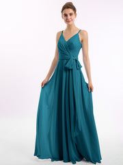 Spaghetti Strap Chiffon Dresses with Sash Bow-Ink Blue