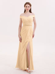 Chiffon Off Shoulder Dresses with Slit-Peach