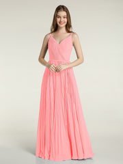 V-neck Full Pleated Skirt Dresses with Bow Sash-Flamingo