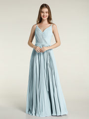 V-neck Full Pleated Skirt Dresses with Bow Sash-Mist