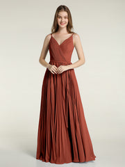 V-neck Full Pleated Skirt Dresses with Bow Sash-Rust