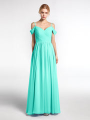 • Simona is an easy going spaghetti strap dress with a V-neckline and floor length hemline.It is a bridesmaids dress with an A-line cut with a pleated bodice in simple chiffon.