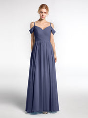 • Simona is an easy going spaghetti strap dress with a V-neckline and floor length hemline.It is a bridesmaids dress with an A-line cut with a pleated bodice in simple chiffon.