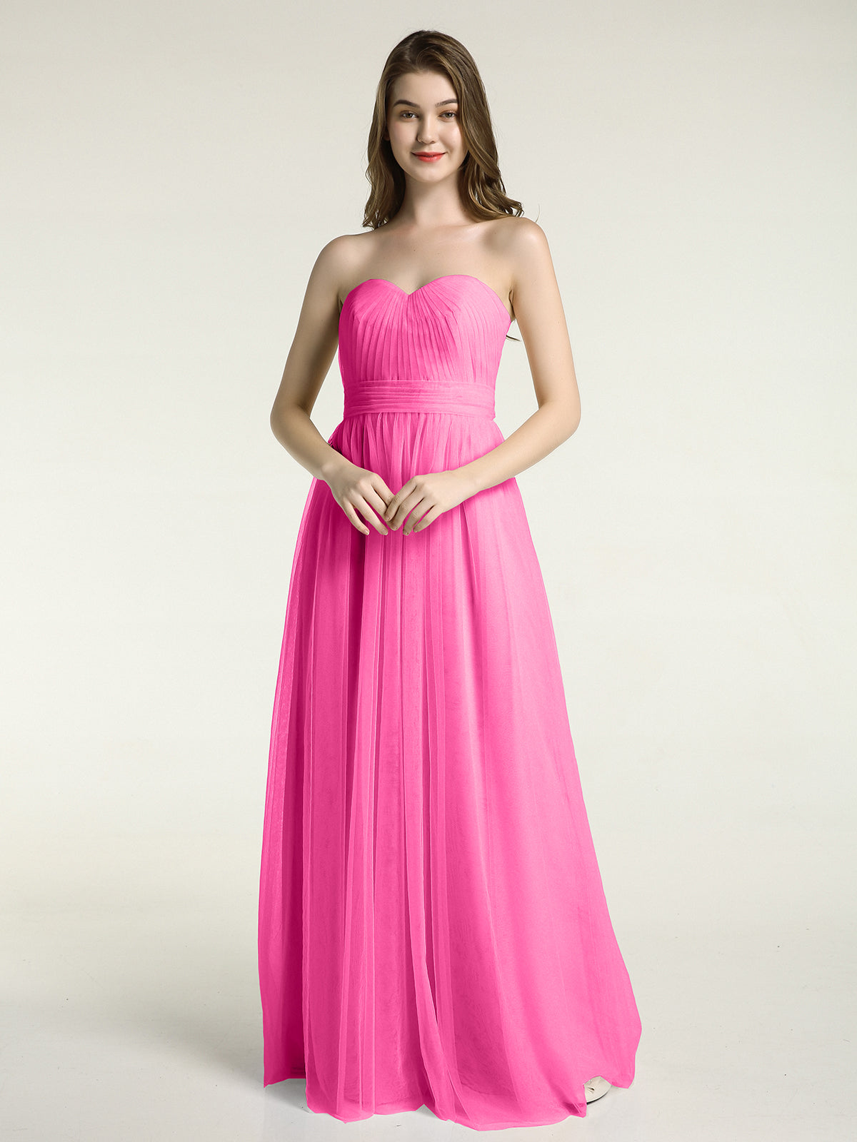 • The pleated upper bodice makes this tulle gown so elegant. And the sash plays an important role in style-making.