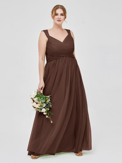 Cross-Pleated Tulle Long Dresses with Beaded Straps Chocolate Plus Size