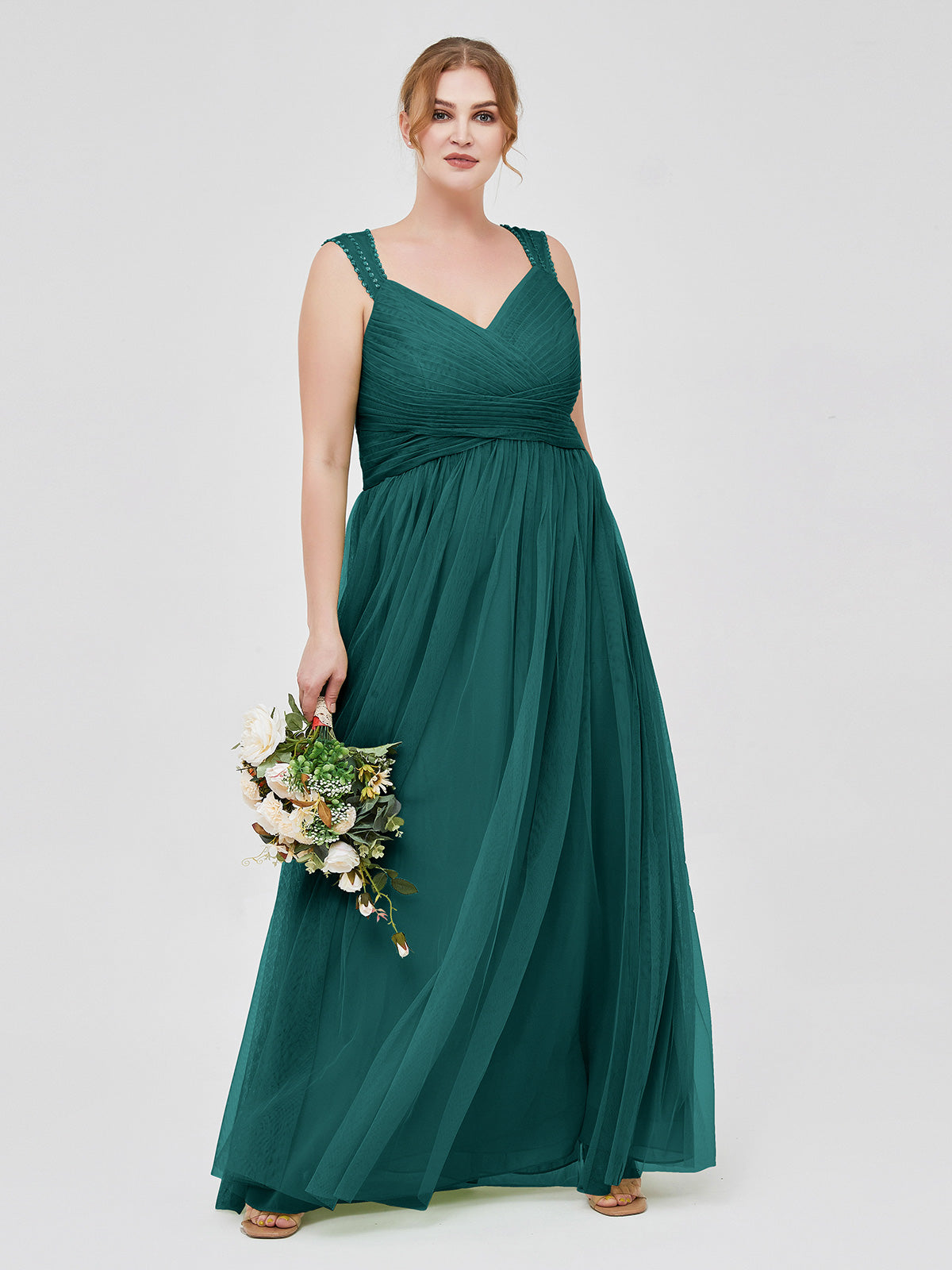 Cross-Pleated Tulle Long Dresses with Beaded Straps Peacock Plus Size