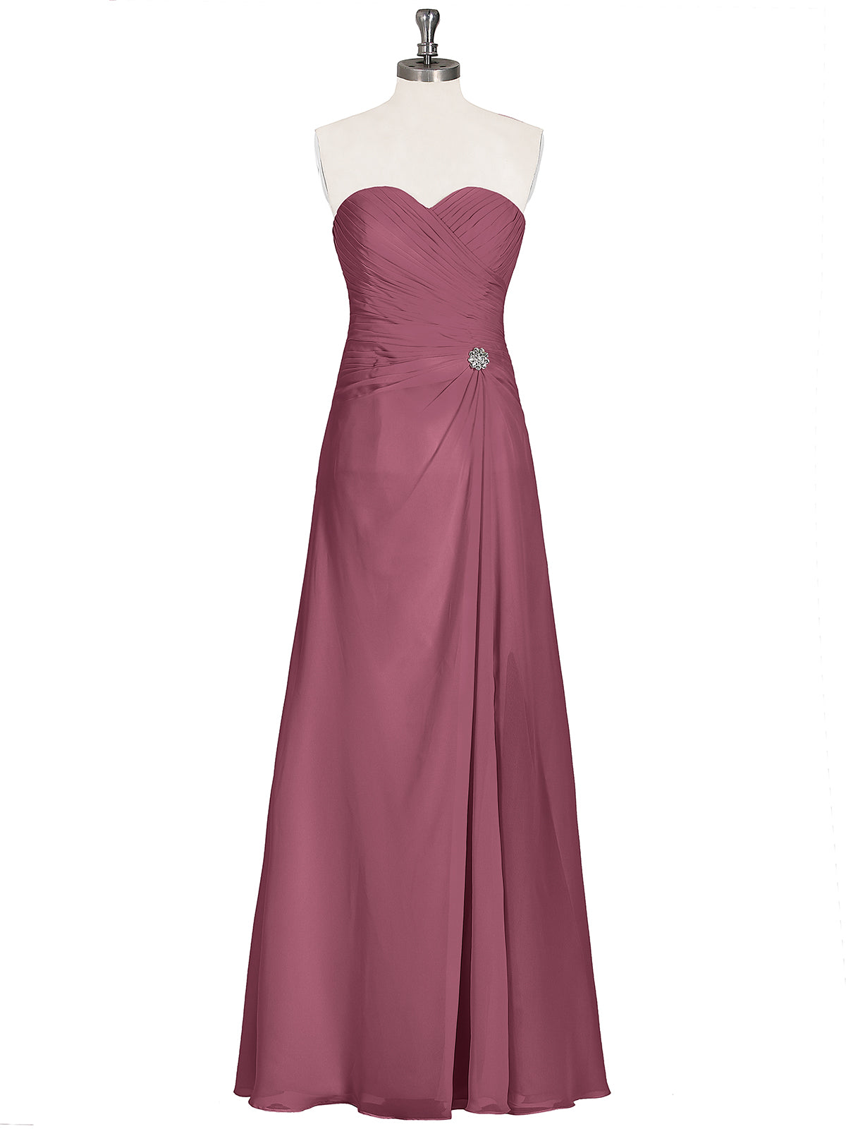 • It features soft, draping pleats with a strapless sweetheart neckline.