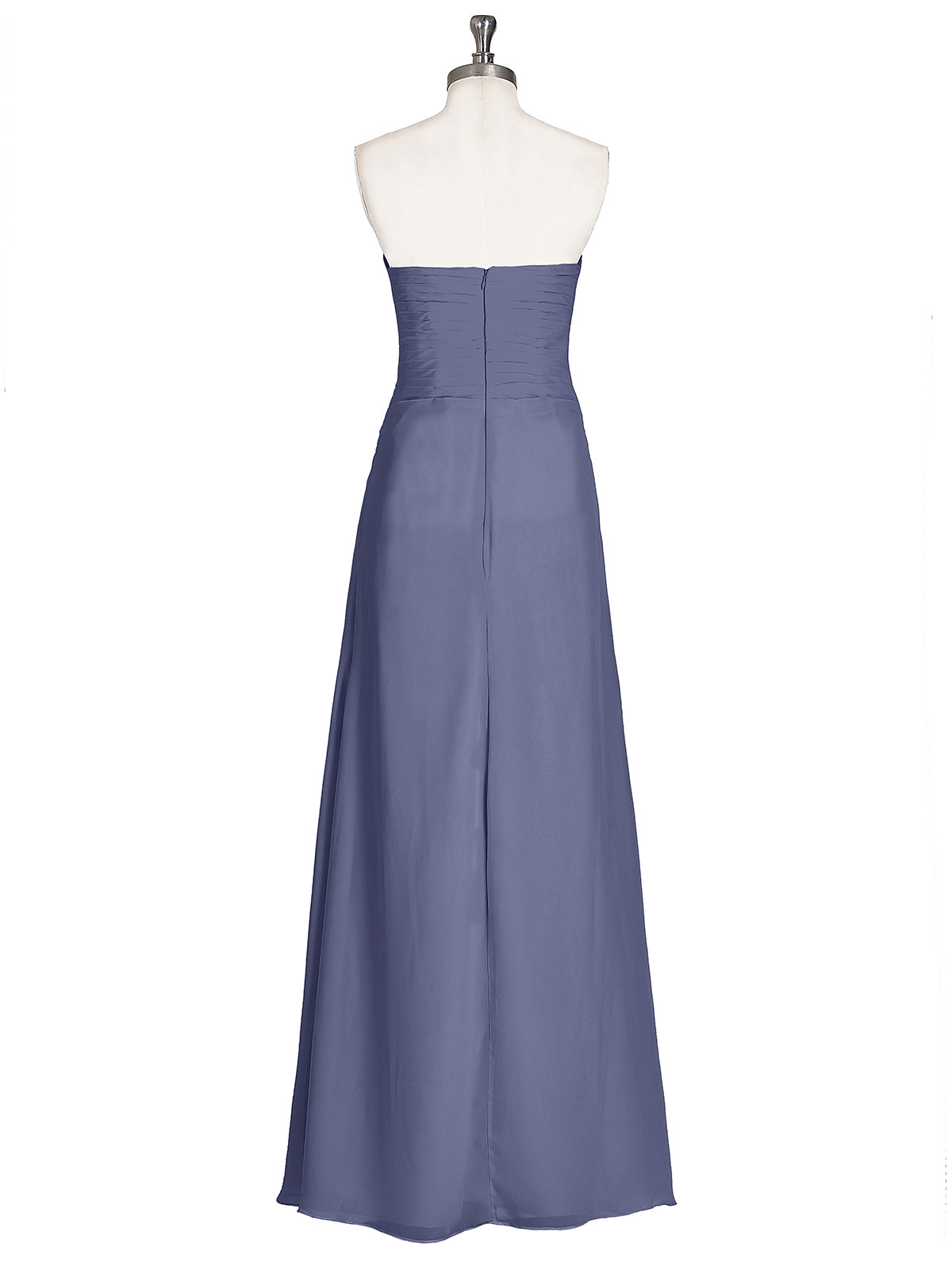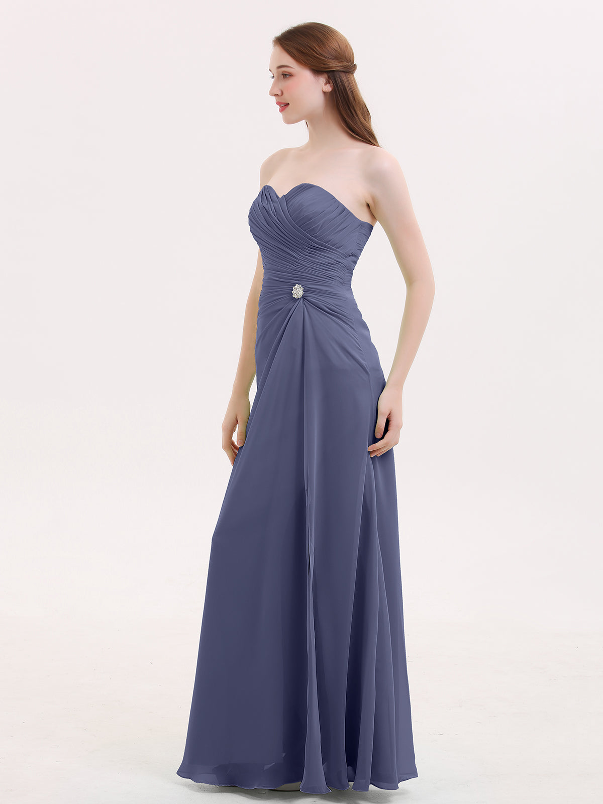 • It features soft, draping pleats with a strapless sweetheart neckline.