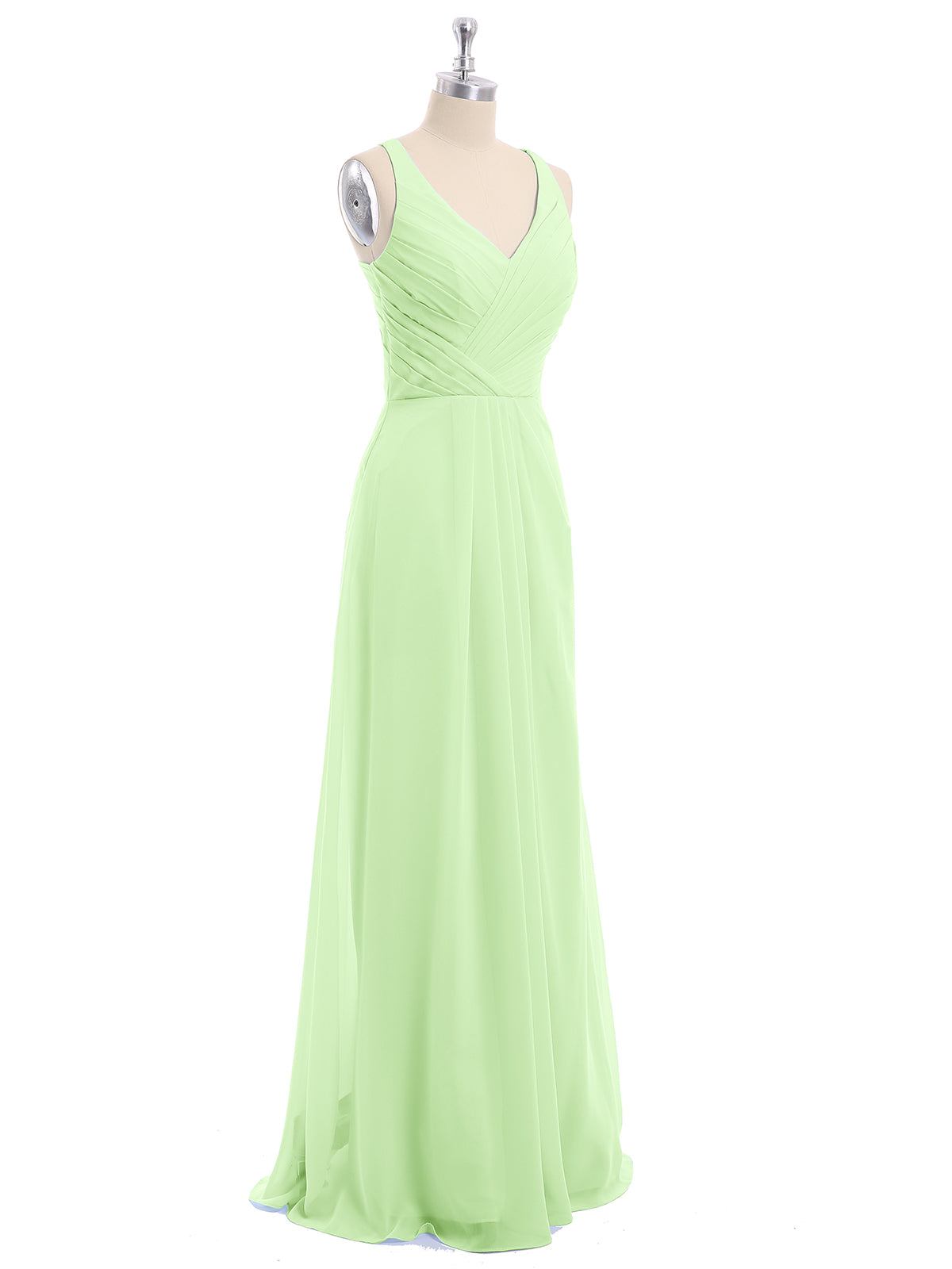 • This is a long chiffon dress with a pleated upper bodice. The charming v neck makes this dress so stunning.
