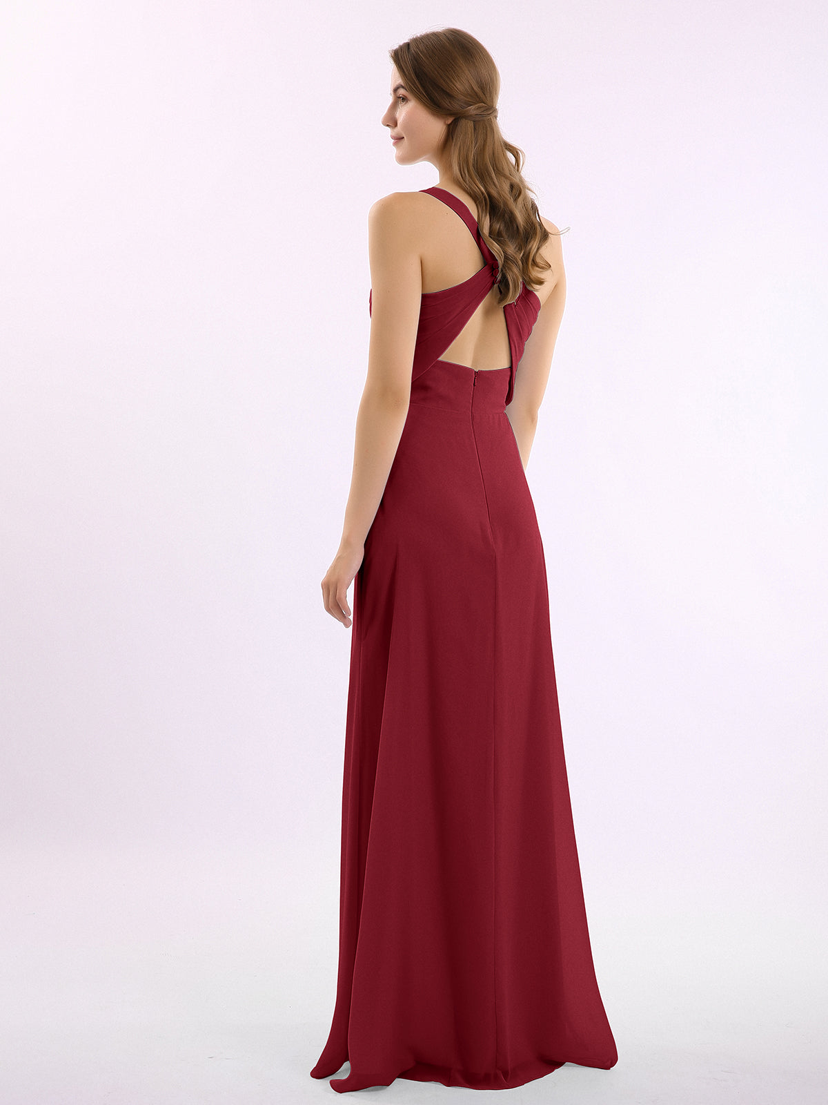 V-neck Chiffon Bridesmaid Dress with Open Back Burgundy