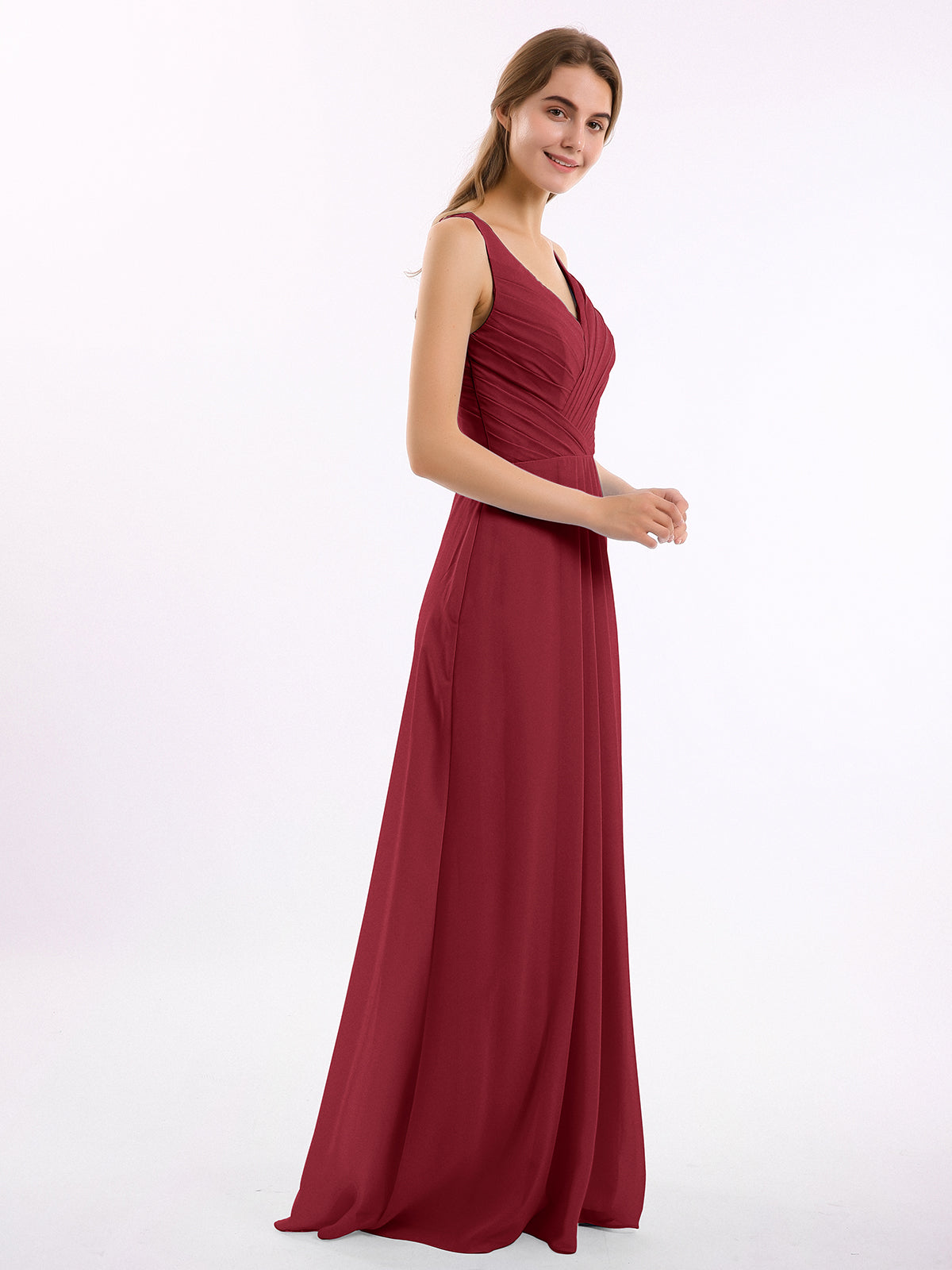 • This is a long chiffon dress with a pleated upper bodice. The charming v neck makes this dress so stunning.
