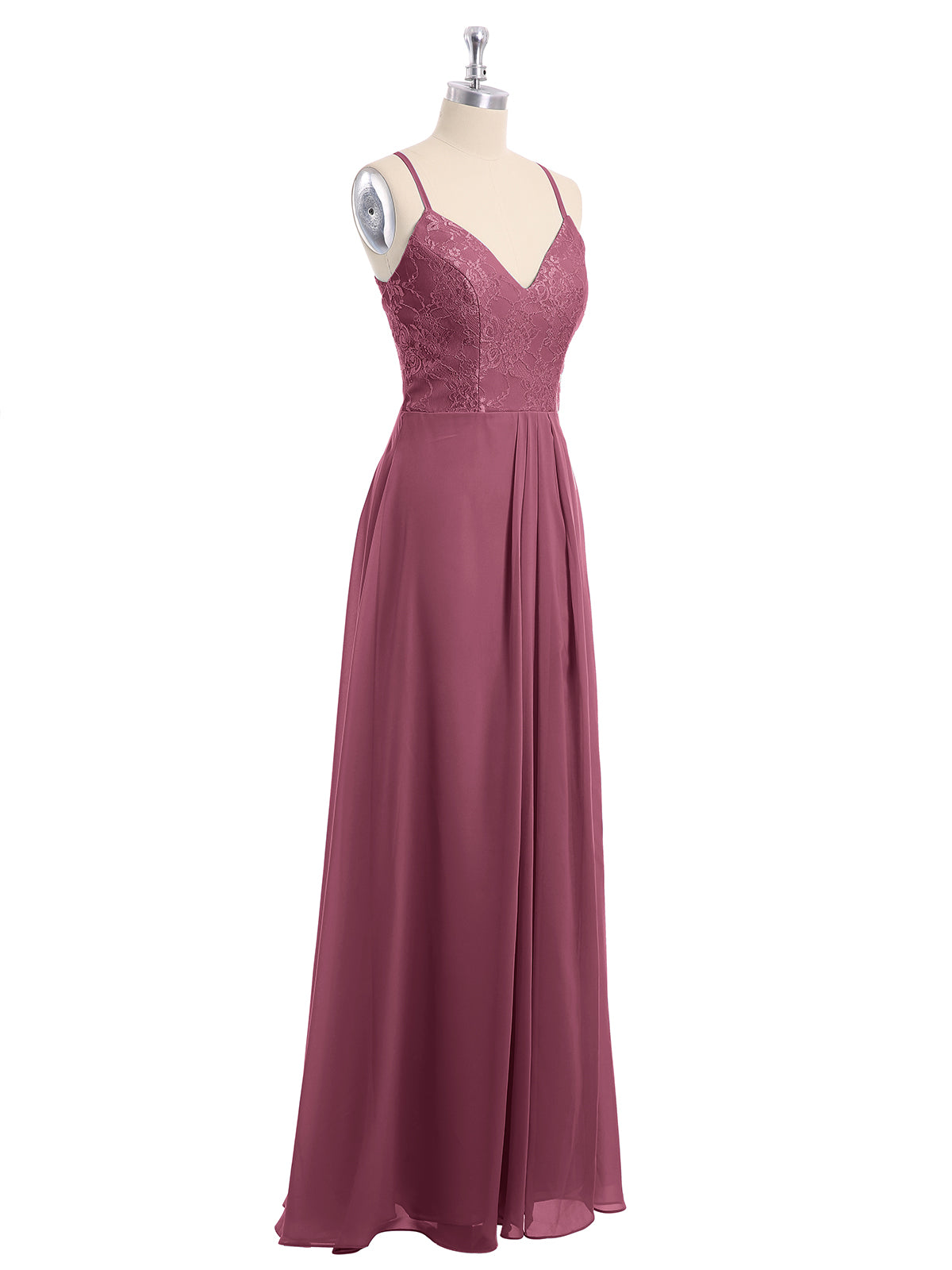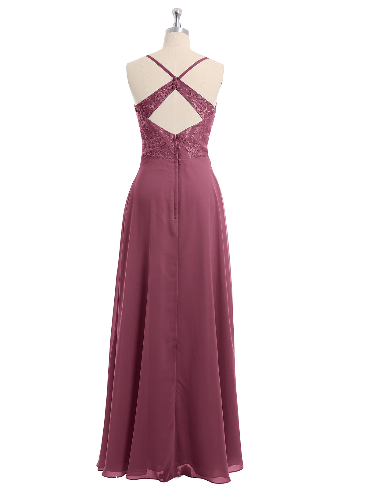 • Wanda is a beautiful long chiffon dress decorated with lace on the upper bodice.