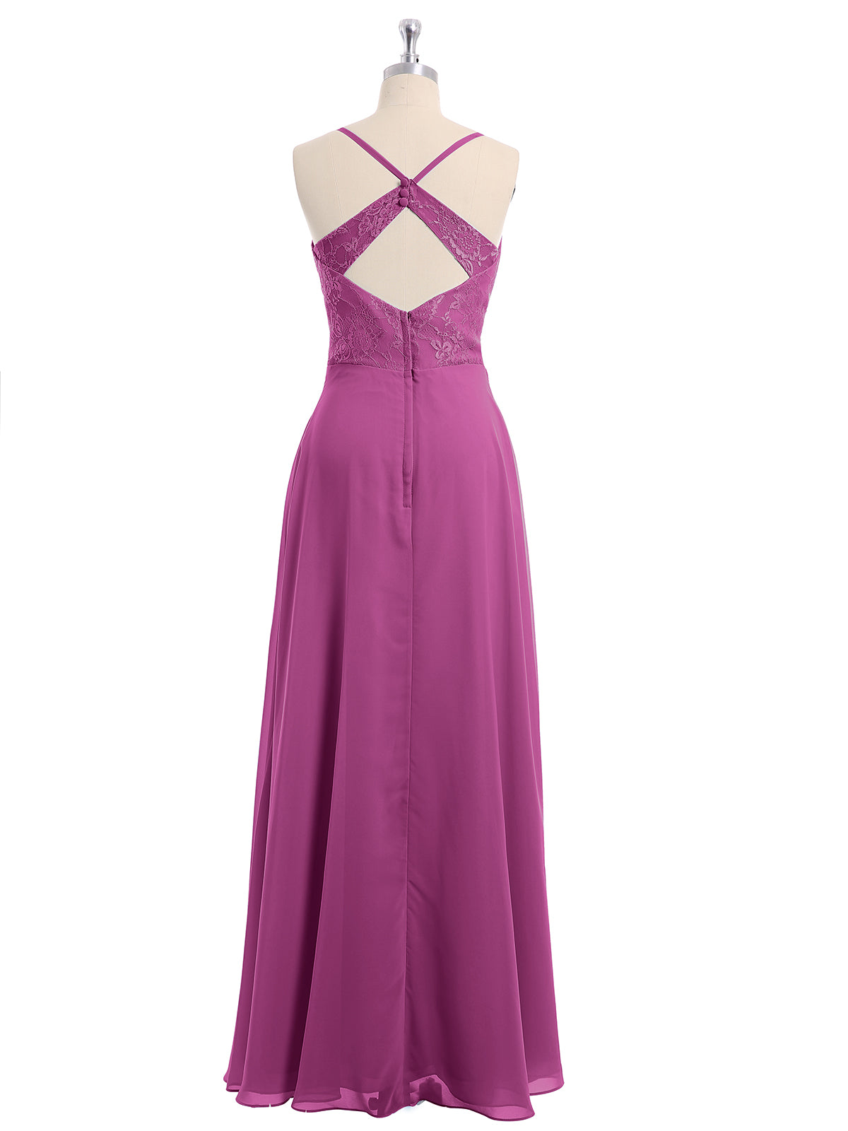 • Wanda is a beautiful long chiffon dress decorated with lace on the upper bodice.