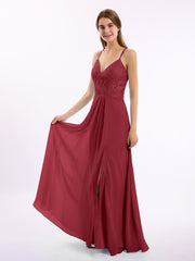 Lace Bodice Chiffon Skirt Dresses with Slit Burgundy