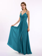 • Wanda is a beautiful long chiffon dress decorated with lace on the upper bodice.