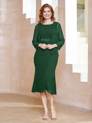 Chiffon Beaded Tea-length Dress with Jacket Dark Green