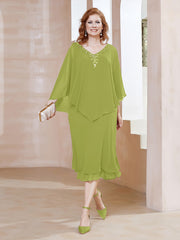 • Experience the understated romance of this chiffon dress! Shimmering rhinestones adorn the V-neckline for a glamorous touch.