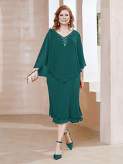 • Experience the understated romance of this chiffon dress! Shimmering rhinestones adorn the V-neckline for a glamorous touch.