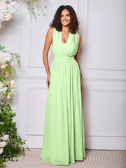 • A versatile bridesmaid dress with a flowy design, featuring two extra-long front streamers attached at the waist. These streamers can be styled in various ways, offering multiple looks for the perfect fit and elegance on the big day.