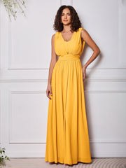 • A versatile bridesmaid dress with a flowy design, featuring two extra-long front streamers attached at the waist. These streamers can be styled in various ways, offering multiple looks for the perfect fit and elegance on the big day.