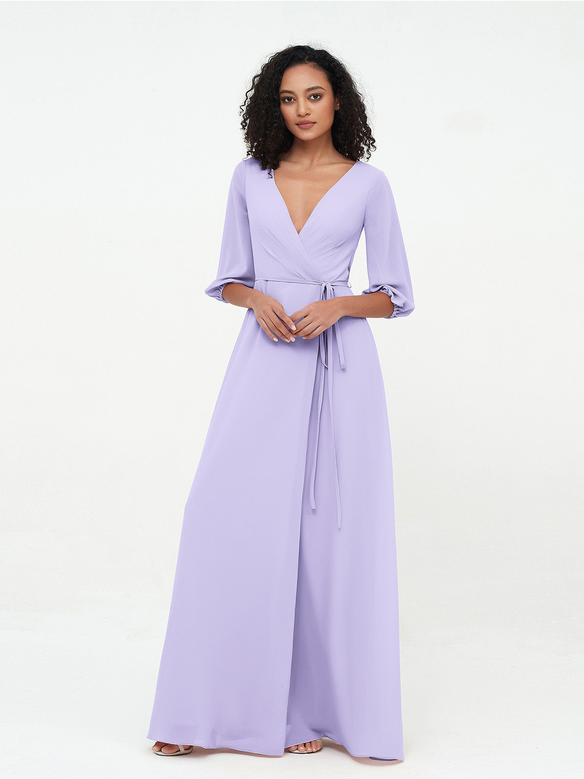 Deep V-neck 1/2 Sleeves Chiffon Max Dresses-Lilac
