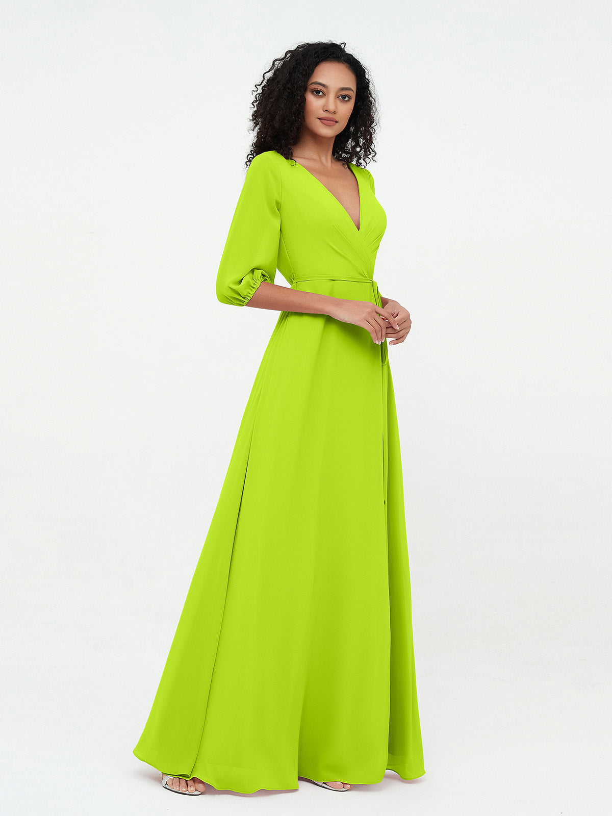 Deep V-neck 1/2 Sleeves Chiffon Max Dresses-Lime Green