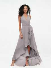 Halter Deep-V Neck Chiffon Asymmetrical Dresses-Silver
