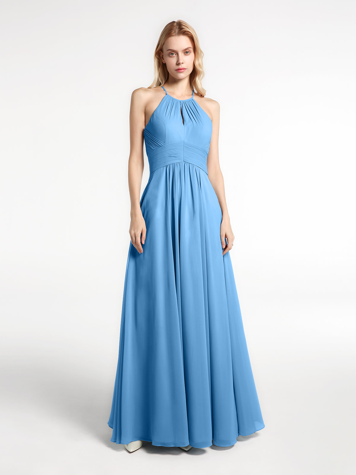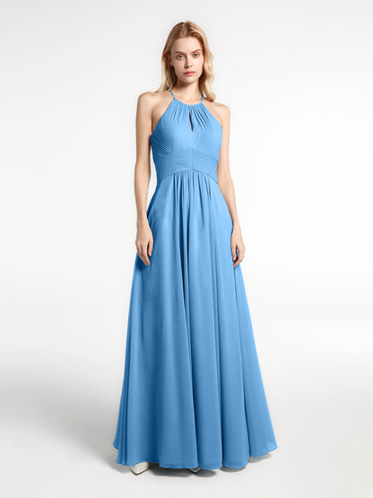 Halter Keyhole Neck Chiffon Dress with Pockets-Blue